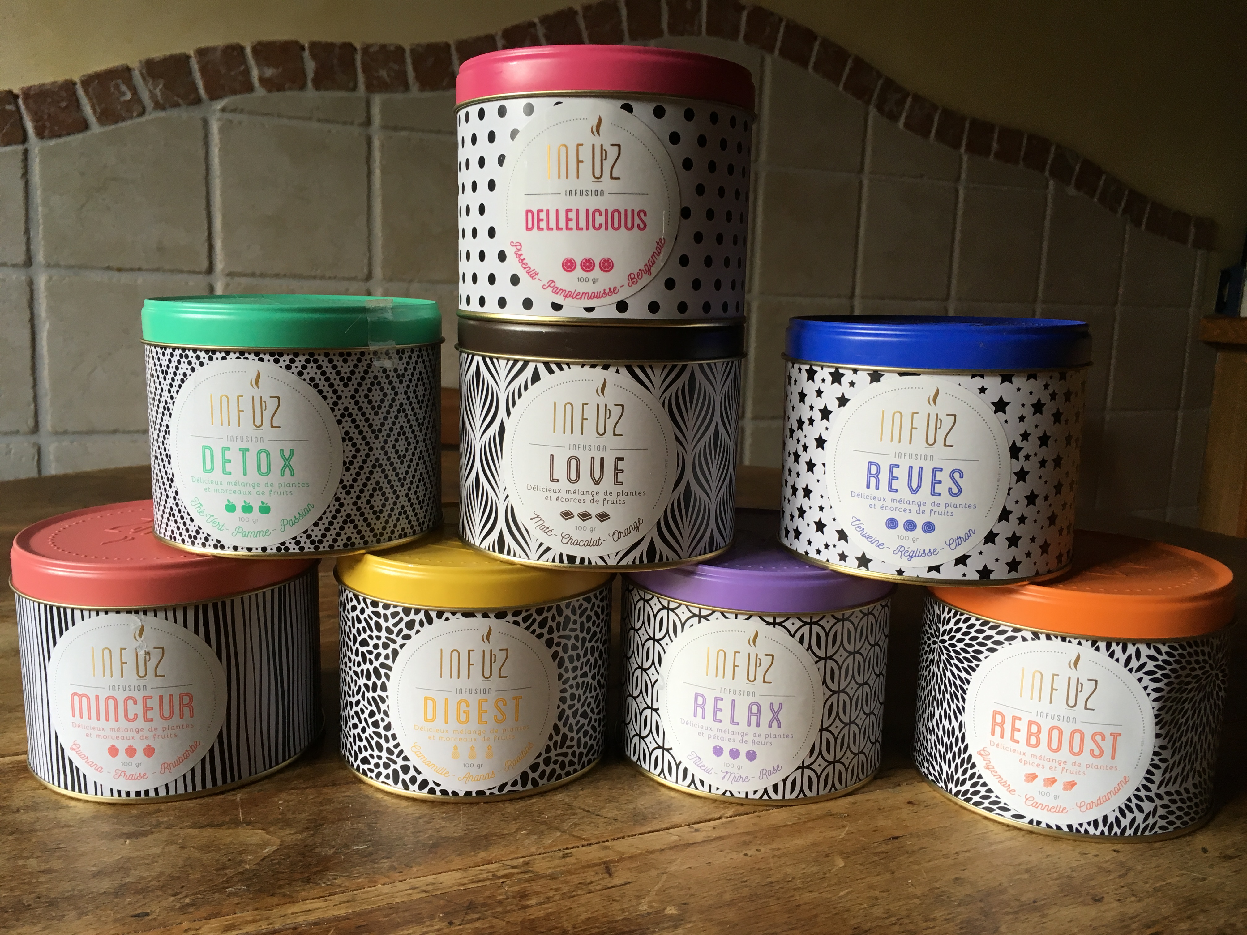 Mais d’abord, parlons d’Infuz. L’idée de la marque est née suite à la réalisation d’une étude de marché qui a prouvé que le rayon infusion dans les grandes et moyennes surfaces se faisait vieillot et laissait un peu à désirer. Le concept a donc été de lancer une marque à prix doux tout, en proposant des produits de qualité : bon, goûtu, jeune et surtout design, histoire de donner un petit coup de jeune aux rayons concernés – je cite.